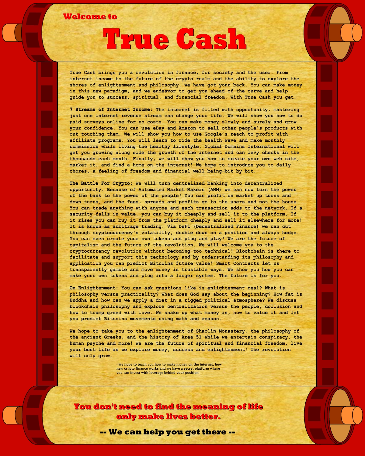 Here is the future of finance and internet income. We bring you the True Cash 7 Streams of Internet Income and Battle for Crypto Manifesto along with its bonus part On Enlightenment.