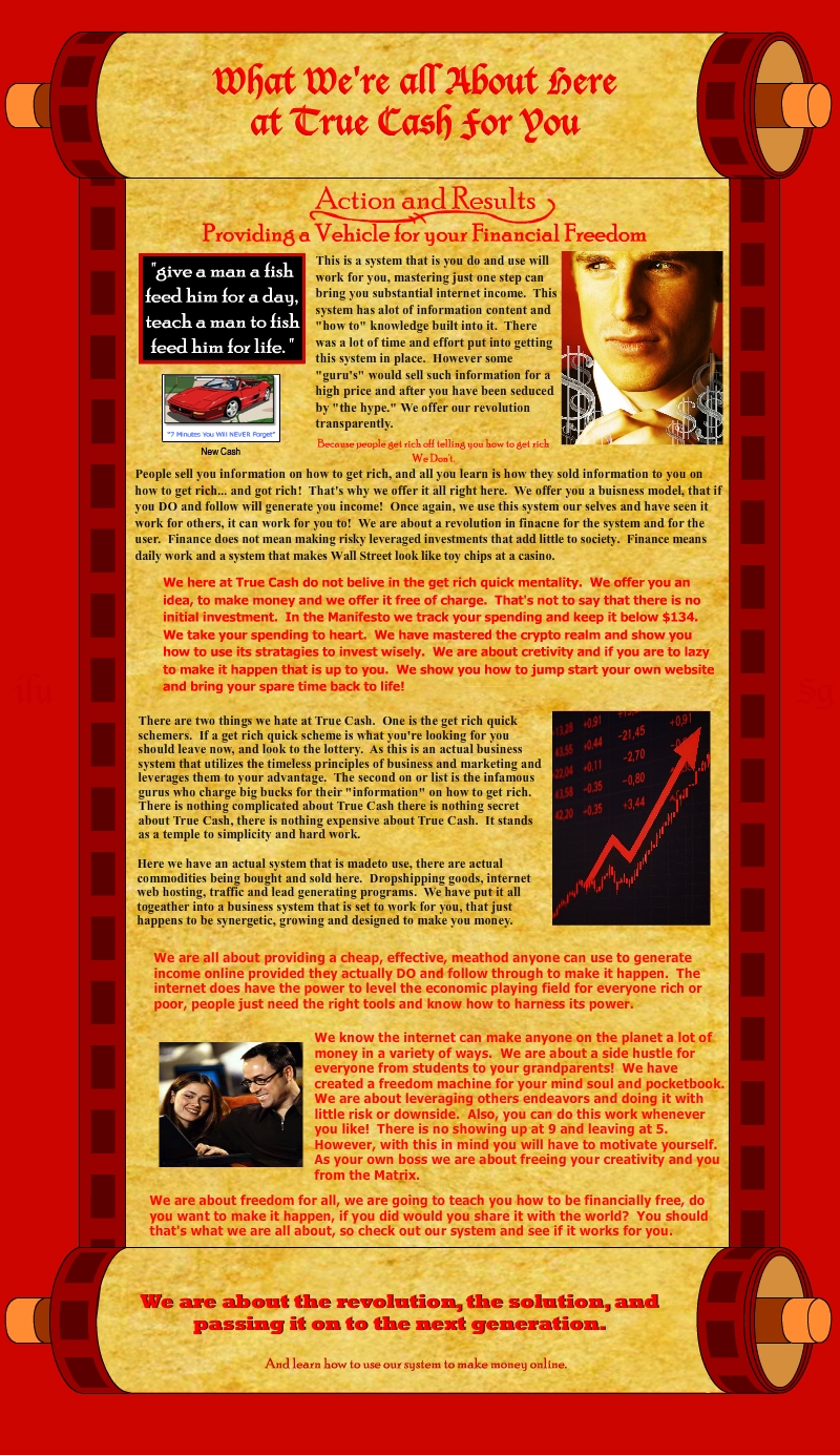 We want you to succeed and expand your horizons. We want you to research how this is done and become a successful, profitable True Cash Member. Internet Income includes eBay, Google, Global Domains International, Ad Sense, Leads, eCommerce and more! We are all about teaching you how a few hours a day can translate into a second income for you and your family. We are about open communications where you can eMail us on the regular. We are about advancing ones life and taking trips to the Bahamas through True Cash Travel!